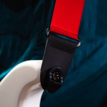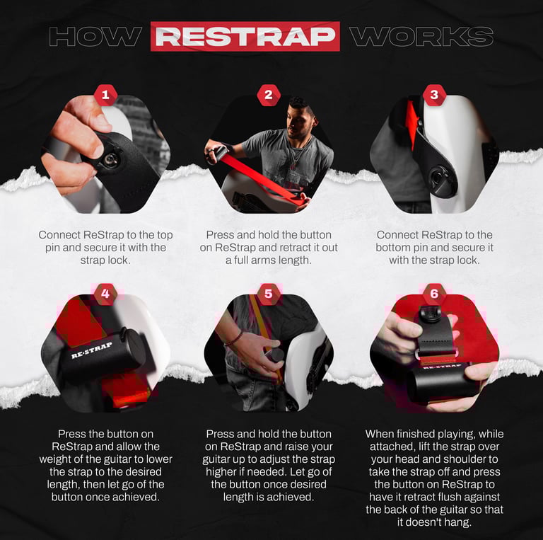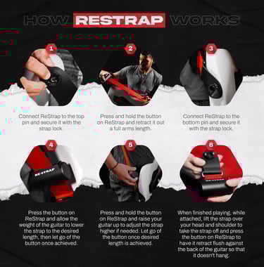 ReStrap guitar straps have a unique patented adjustable feature that allow you to retract the strap with the push of a button using the weight of the guitar, doing away with the time-consuming adjustments of a traditional strap.
